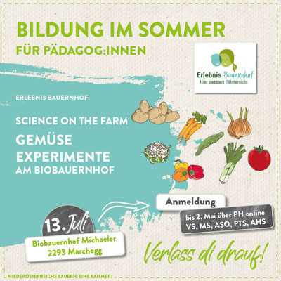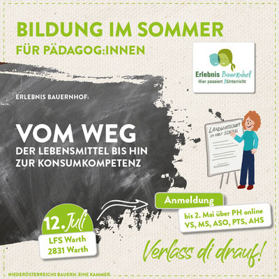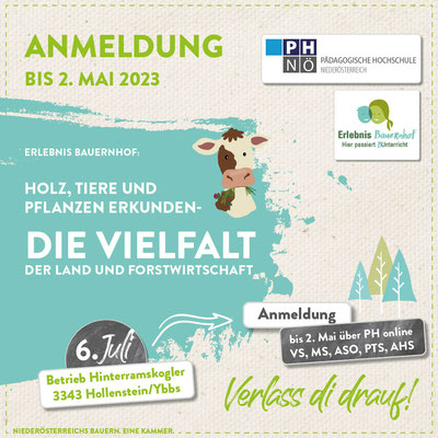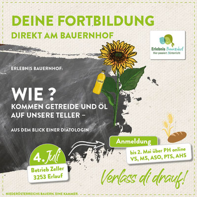 Pädagog:innen aufgepasst! Im Rahmen der Pädagogen-Fortbildung „Bildung im Sommer“ kann der Weg unserer Lebensmittel hautnah verfolgt werden. Bäuerinnen und Bauern geben Einblick und stehen für Fragen rund um die heimische Lebensmittelerzeugung bereit. Es erwarten Sie eine Erlebnisführung am Bauernhof und Methoden die auch im Klassenzimmer umgesetzt werden können. Die Fortbildungen werden in Kooperation mit der PH Niederösterreich angeboten und richten sich an VS, MS, ASO, PTS und AHS. Anmeldungen werden per Mail gerne noch entgegen genommen: birgit.plank@lk-noe.at
