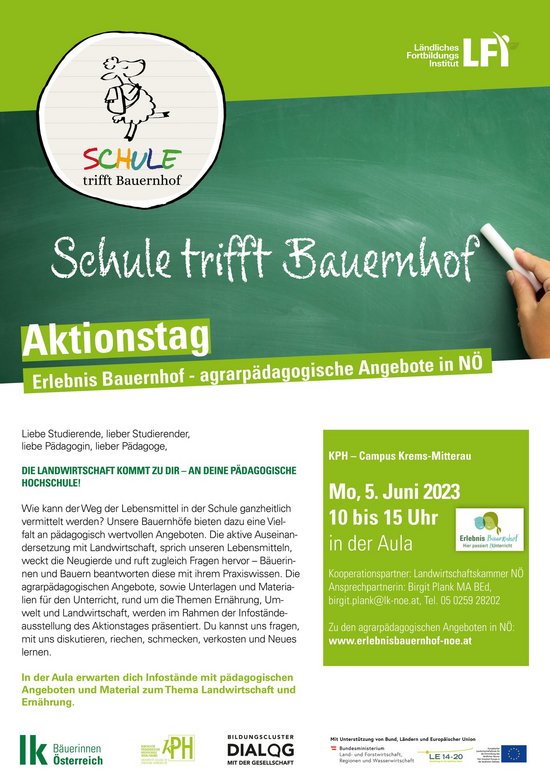 Bereits zum dritten Mal findet am Montag, 5. Juni 2023 an der Kirchlich Pädagogischen Hochschule Wien/Krems - Campus Krems Mitterau der Aktionstag "Schule trifft Bauernhof" statt. Die aktiven sowie angehenden Pädagog:innen erwarten hierbei Infostände zu den agrarpädagogischen Angeboten in Niederösterreich sowie Begleitmaterialien, Arbeitsblätter, etc. zu den Themen Landwirtschaft und Ernährung, für den eigenen Unterricht.